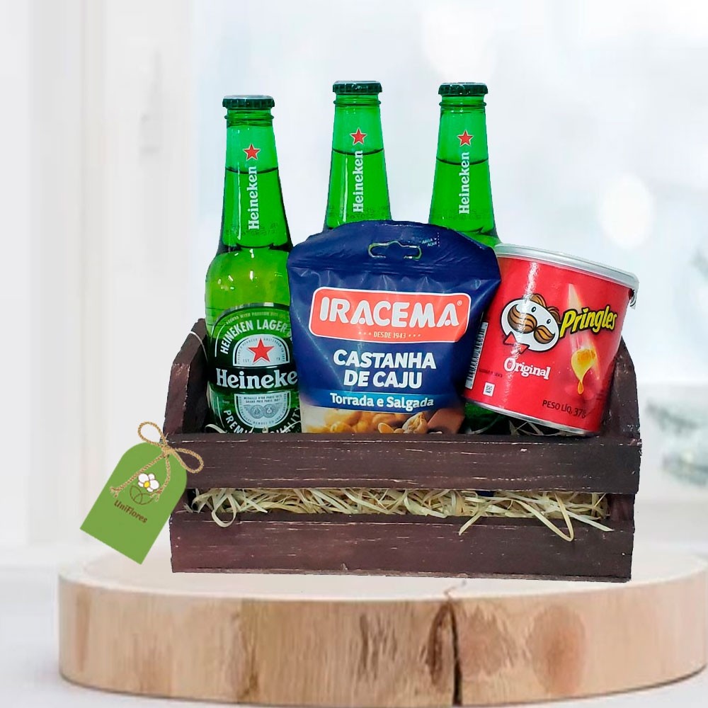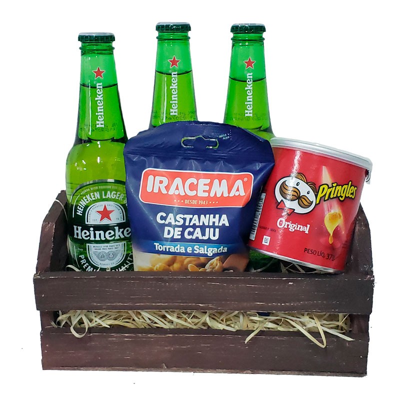 Que tal enviar um kit que todo amante de cervejas iria adorar? Num belo cachepot de madeira e embalados para presente, 3 garrafas de cerveja Heineken Long Neck e dois tipos de aperitivo, como Batatas Pringles e Castanhas de Caju ou amendoins.