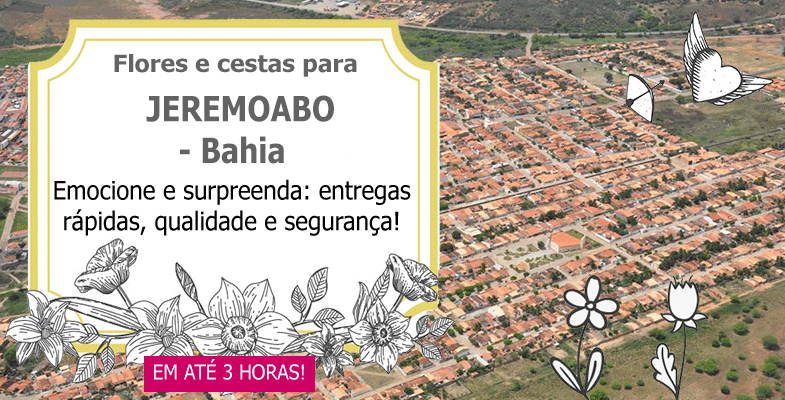 Efetuamos entregas de flores e cestas em Jeremoabo até no mesmo dia, através das melhores floriculturas locais. Conforme o horário da compra, podemos fazer a entrega das fores em Jeremoabo em até 3 horas. Jeremoabo é um município brasileiro do estado da Bahia . A região de Jeremoabo, no nordeste da Bahia, foi povoada originalmente por Tupinambás dos grupos Muongorus e Cariacás. A palavra Jeremoabo em língua tupinambá significa "plantação de jerimum".