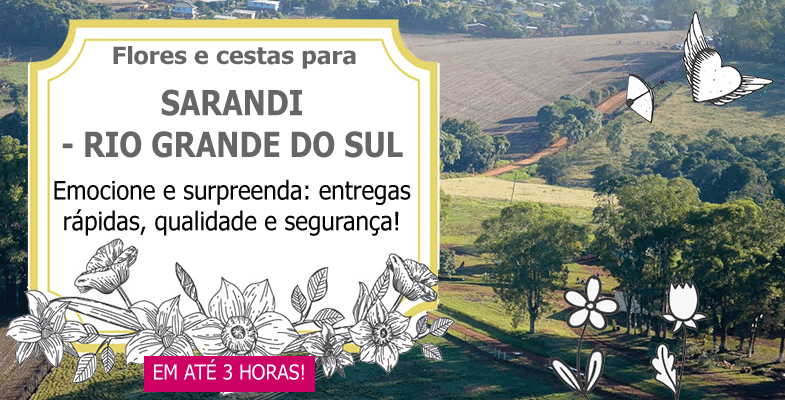 Efetuamos entregas de flores e cestas em Sarandi - RS até no mesmo dia, através das melhores floriculturas locais. Conforme o horário da compra, podemos fazer a entrega das fores em Sarandi - RS em até 3 horas. Sarandi - RS é um município brasileiro do estado do Rio Grande do Sul. O Município de Sarandi - RStem seu território formado por terras que, inicialmente faziam parte de Rio Pardo (1809), desmembrado após para o município de Cachoeira do Sul (1819), mais tarde Cruz Alta (1834) e finalmente em 1857, Passo Fundo.