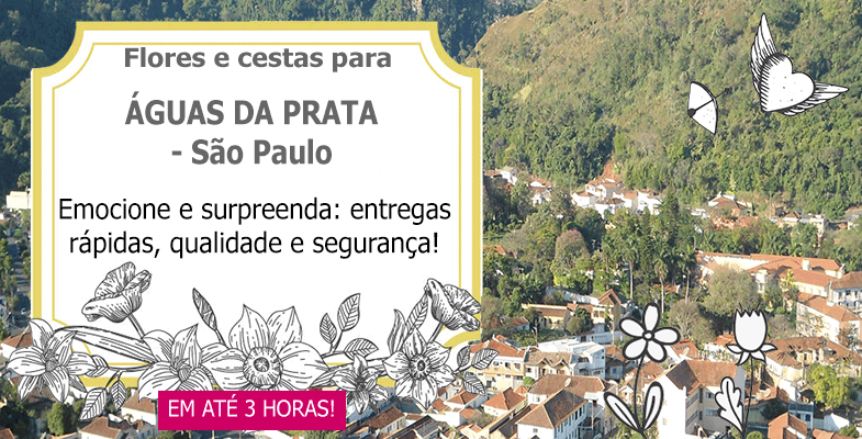 Efetuamos entregas de flores e cestas em Águas da Prataaté no mesmo dia, através das melhores floriculturas locais. Conforme o horário da compra, podemos fazer a entrega das fores em Águas da Prataem até 3 horas. Águas da Prata é um município brasileiro do estado de São Paulo. O município de Águas da Prata deve sua existência em razão de grande quantidade de sais minerais encontradas em suas águas sendo que a origem do nome vem de uma corruptela do tupi-guarani "Pay tâ" que ao ser pronunciada pelos portugueses tornou-se "Prata" "Pay tâ" que quer dizer em tupi-guarani "água dependurada" em virtude da alta mineralização das águas que ao escorrerem próximas as minas formam estalactites. Nas nascentes era constatada a presença de animais silvestres como: antas, veados, capivaras, queixadas, porco do mato e muitos outros.