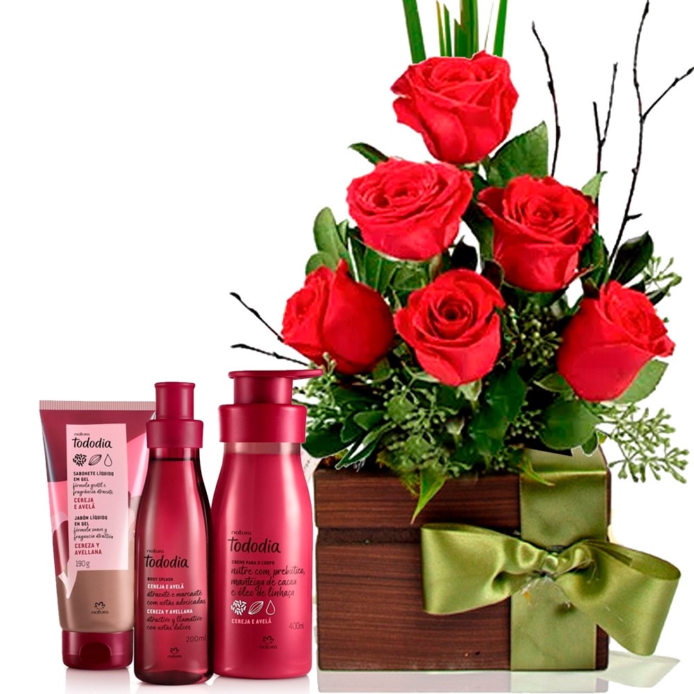 Arranjo de 6 rosas com Kit Natura Tododia Cereja e Avelâ