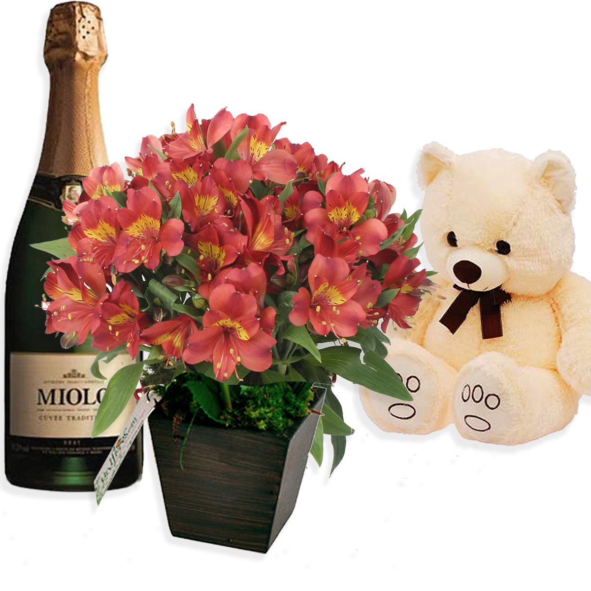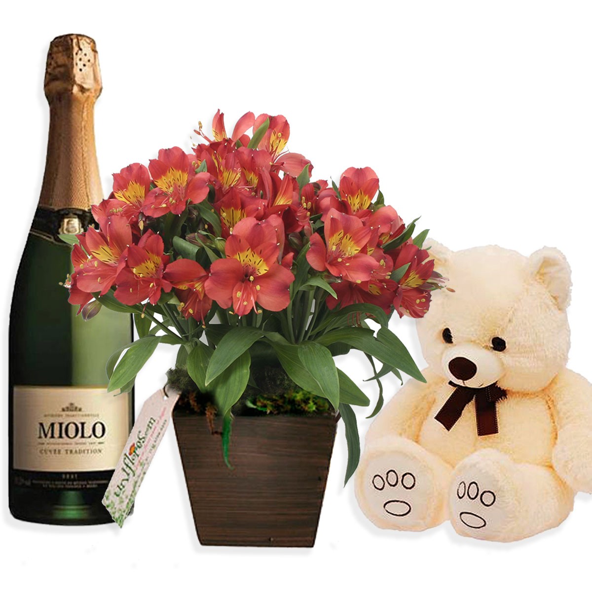 Coloridas alstroemérias em um cachepot/vaso de madeira. As alstroemérias são flores delicadas e belas, com tonalidades e padrões diversos e encantadores. Neste arranjo a beleza e harmonia das flores forma um presente delicado que é certeza de surpreender e agradar em todos os momentos especiais. Aproximadamente 30 cm de altura. Este belo arranjo de flores é acompanhado também por um romântico e delicado ursinho de pelúcia (tamanho pequeno, aproximadamente 25 centímetros de altura, modelos variados) e um vinho espumante branco nacional (750 ml).