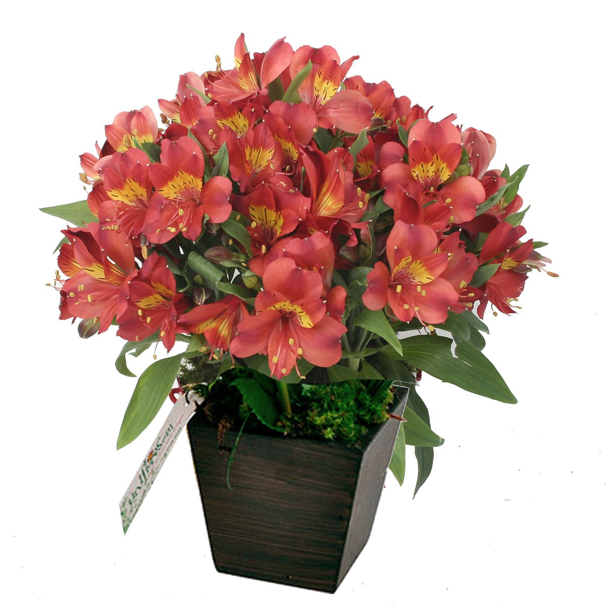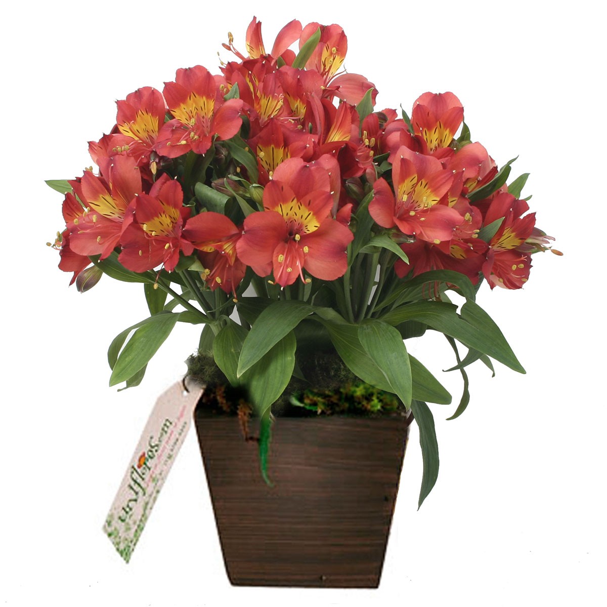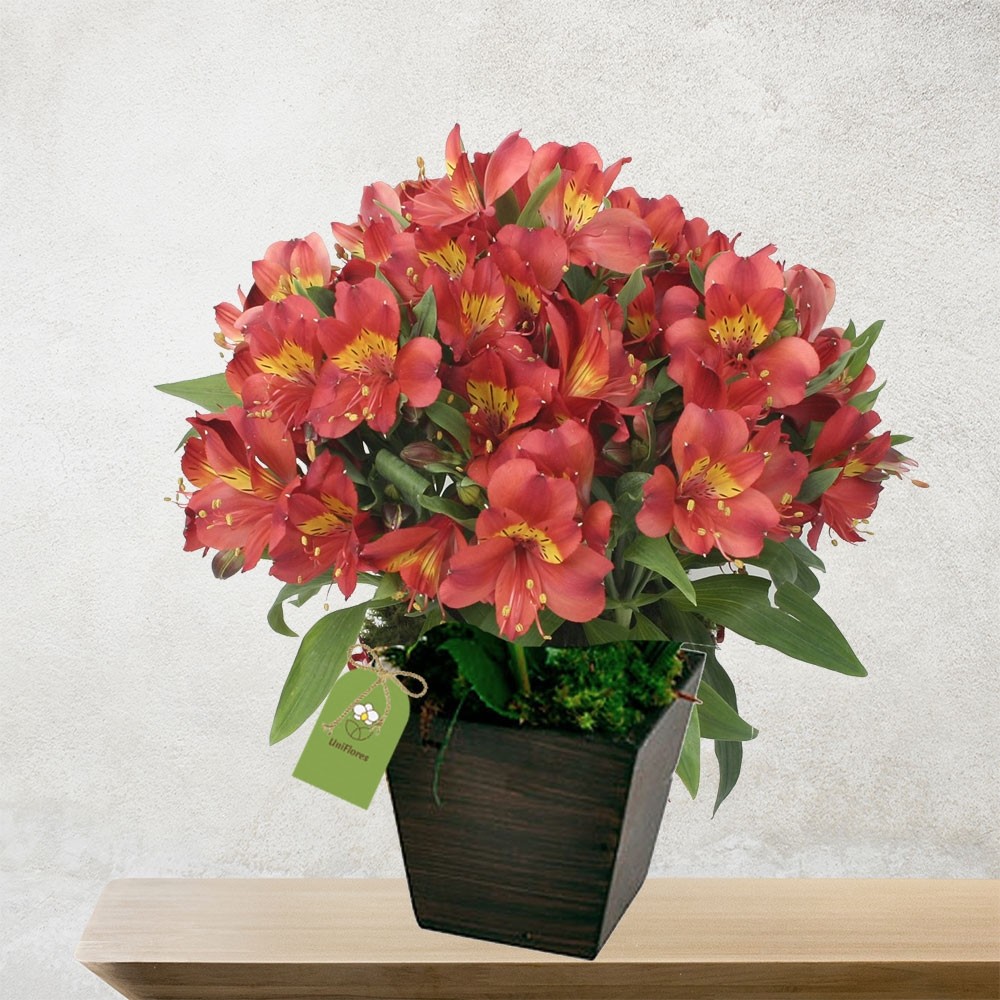 Coloridas alstroemérias em um cachepot/vaso de madeira. As astroméliassão flores delicadas e belas, com tonalidades e padrões diversos e encantadores. Produzido com flores frescas e selecionadas, por isso estão sujeitas à substituição por flores equivalentes conforme a localidade, esse produto é confeccionado localmente na data da entrega com todo carinho por nossos floristas locais. Assim as flores não sofrem com viagens em longas distâncias, preservando sua qualidade, frescor e perfume.