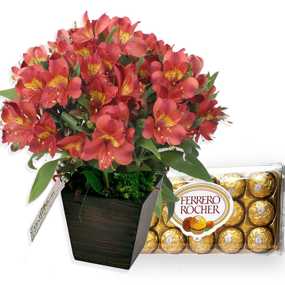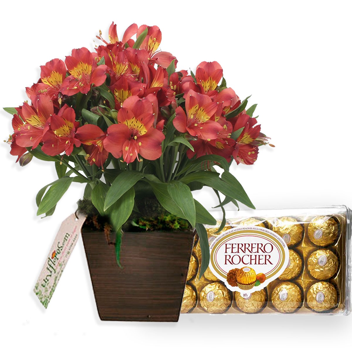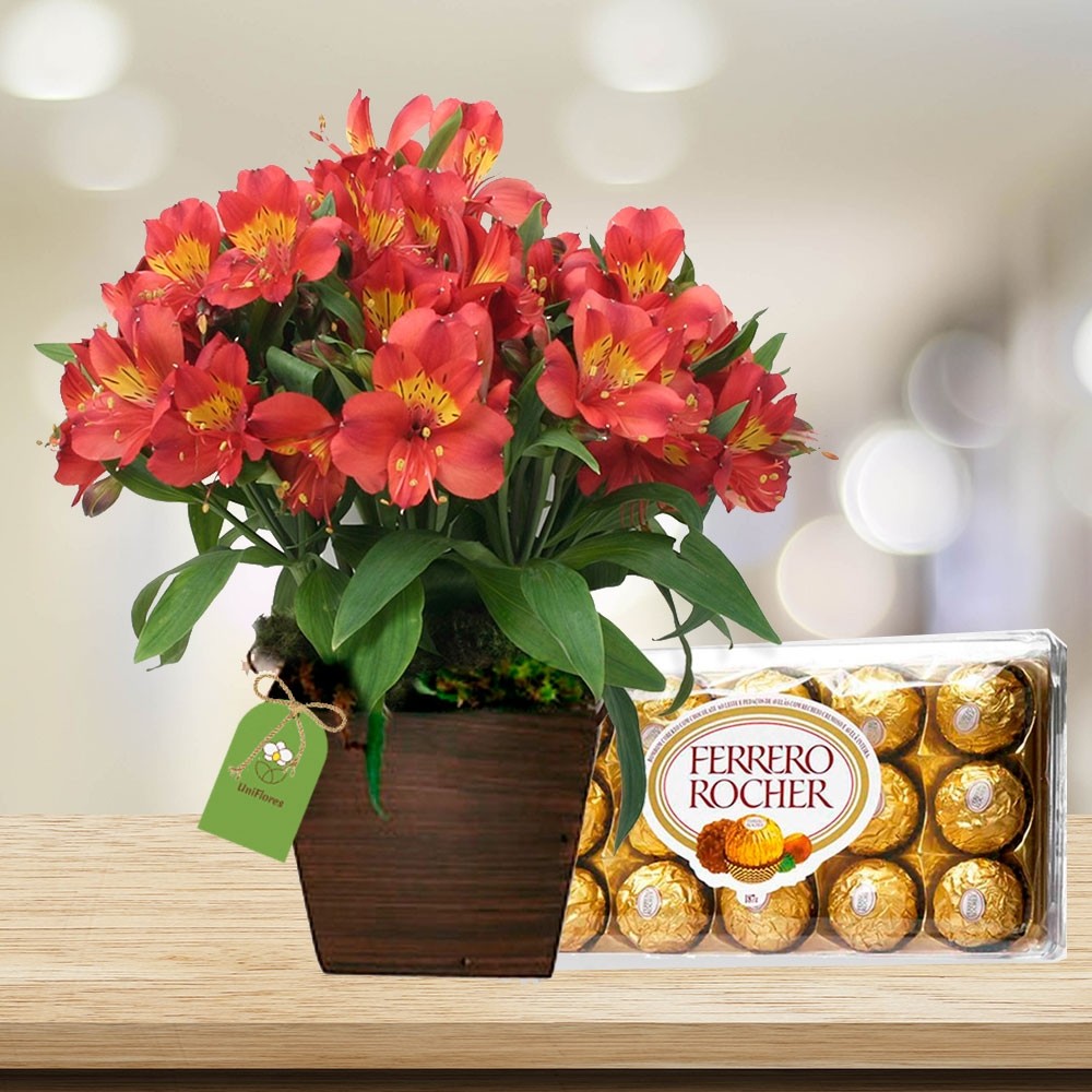 Coloridas astromélias em um cachepot/vaso de madeira. As astromélias são flores delicadas e belas, com tonalidades e padrões diversos e encantadores. Neste arranjo a beleza e harmonia das flores forma um presente delicado que é certeza de surpreender e agradar em todos os momentos especiais. Aproximadamente 30 cm de altura. Este belo arranjo de flores é acompanhado também por uma caixa com 12 deliciosos bombons Ferrero Rocher. Obs.: como em todos os nossos produtos, o preço apresentado já é o preço final para entrega na cidade escolhida. Não existem taxas adicionais, e o frete é grátis para a entrega normal!.