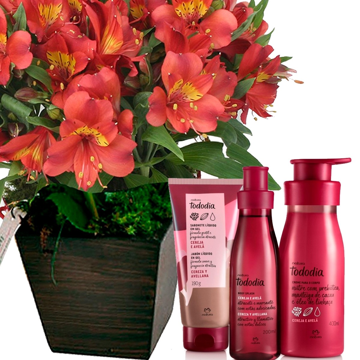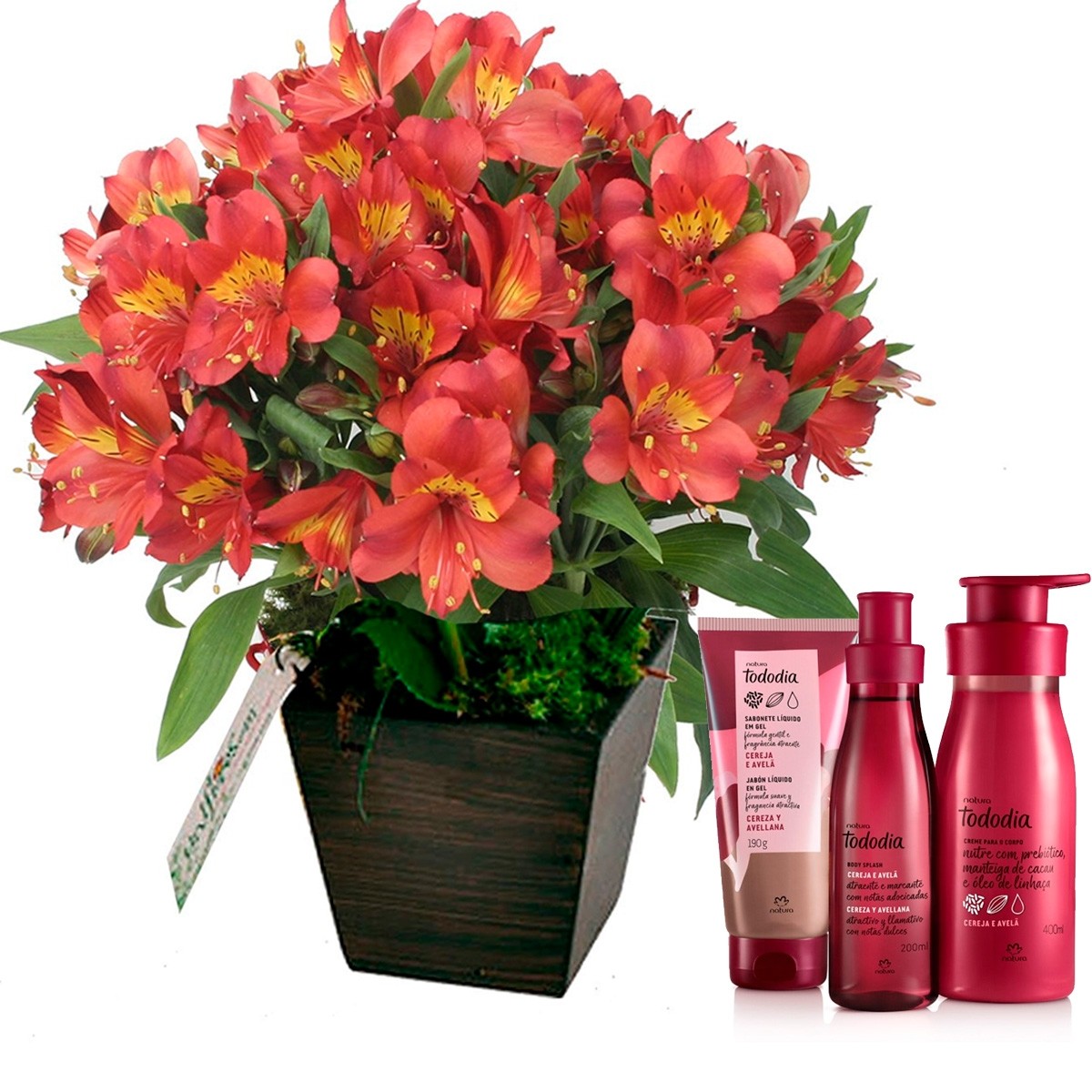 Arranjo de Astromélias com Kit Natura Tododia Cereja e Avelâ