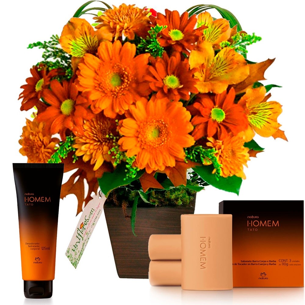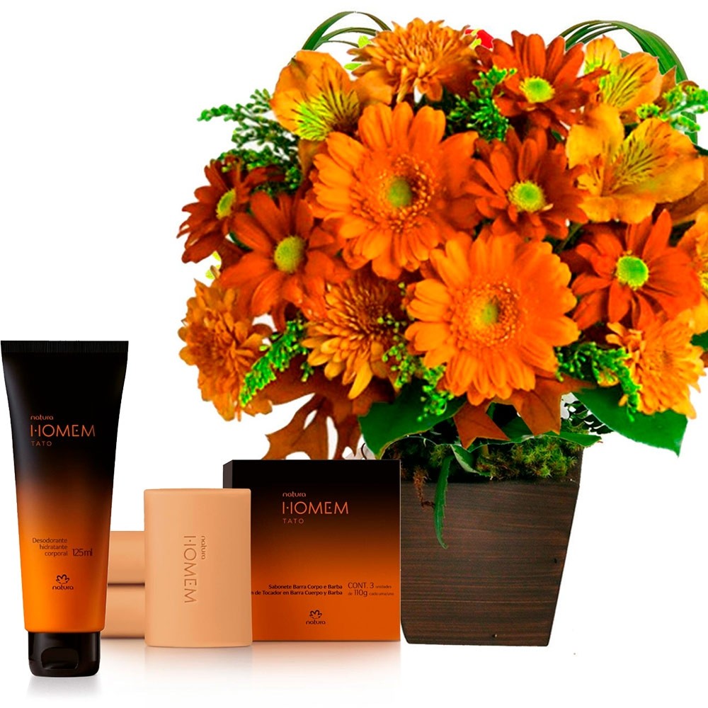 Para presentear e surpreender em momentos especiais através da beleza e perfume tanto das flores como dos produtos Natura. Este elegante arranjo de flores para presente é composto com flores da época (gérberas, rosas, alstroemérias, crisântemos, etc) em tons de vermelho, laranja e amarelo, e folhagens especiais, montado em um cachepot de madeira artesanal e o Kit Natura Homem Tato com sabonete e hidrante, um cuidado completo na nova fragrância amadeirada intensa de Natura.