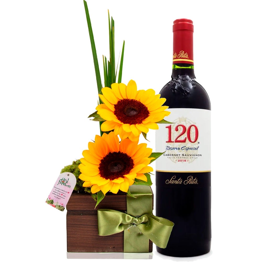 Delicado arranjo Mimo de Girassóis com vinho tinto mpara presentear!