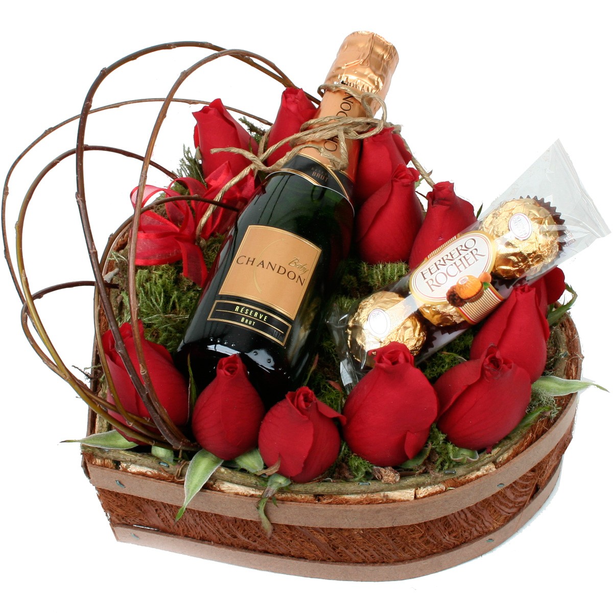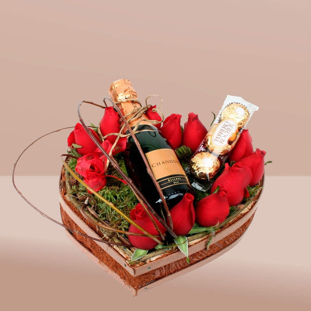 Uma opção romântica e carinhosa: surpreenda e encante com este elegante arranjo de flores em formato de coração com aglomerado de rosas e folhagens, acompanhando uma garrafa de espumante Baby Chandon (187 ml) e 3 bombons Ferrero Rocher. Produtos sujeitos à substituição por itens de outras marcas e de valor equivalente conforme disponibilidade na cidade de entrega, visando sempre manter a qualidade, harmonia e beleza do presente.