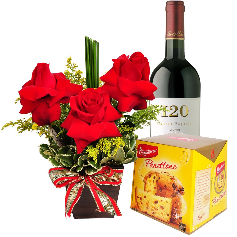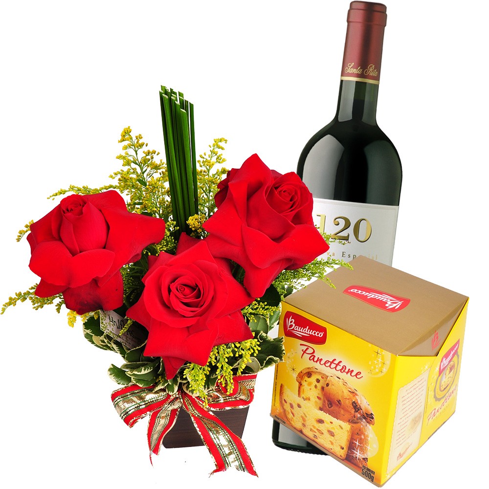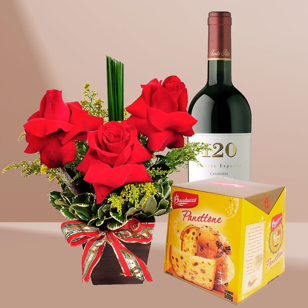 Belo arranjo com 4 rosas vermelhas em um cachepot de madeira, decorado com juncos, acompanhado de um panettone delicioso e um vinho. Um arranjo belo e delicado para enviar sua mensagem especial. Produzido com flores frescas e selecionadas, sujeitas por isso à substituição por flores equivalentes conforme a localidade, esse produto é confeccionado localmente na data da entrega com todo carinho por nossos floristas locais. Assim as flores não sofrem com viagens em longas distâncias, preservando sua qualidade, frescor e perfume.