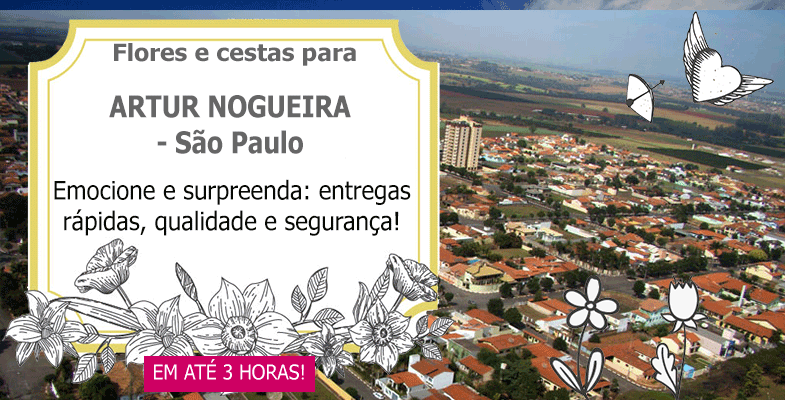 Efetuamos entregas de flores e cestas em Artur Nogueiraaté no mesmo dia, através das melhores floriculturas locais. Conforme o horário da compra, podemos fazer a entrega das fores em Artur Nogueiraem até 3 horas. Artur Nogueira é um município brasileiro do estado de São Paulo. O município foi fundado, entre outros, pelo madeirense Daniel Cesário de Andrade, chegado ao Brasil cerca de 1910.