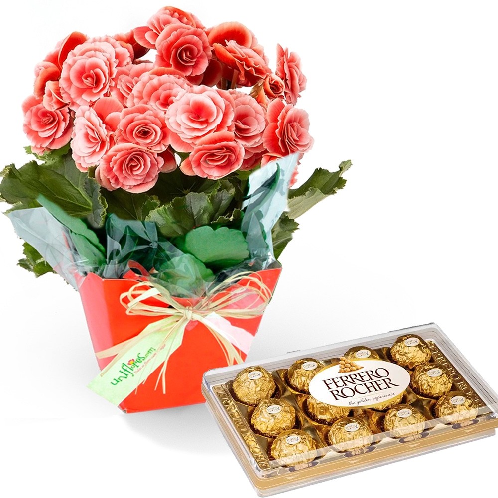 As Begônias são belas flores para presentear e podem ser encontradas em diversas cores. Demonstre carinho e envie sua mensagem especial com este belo presente. E para deixar ainda mais especial o dia da pessoa presenteada, acompanha também uma Caixa de Bombons Ferrero Rocher com 12 bombons (190 g) Produzido com flores frescas e selecionadas, sujeitas por isso à substituição por flores equivalentes ou variação de cores conforme a localidade, esse produto é confeccionado localmente na data da entrega com todo carinho por nossos floristas locais. Assim as flores não sofrem com viagens em longas distâncias, preservando sua qualidade, frescor e perfume.