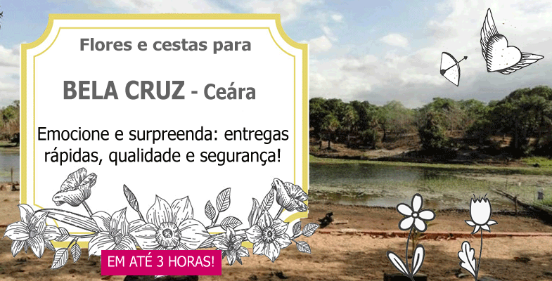 Efetuamos entregas de flores e cestas em Bela Cruzaté no mesmo dia, através das melhores floriculturas locais. Conforme o horário da compra, podemos fazer a entrega das fores em Bela Cruzem até 3 horas. Bela Cruz é um município brasileiro, do estado do Ceará, localizado às margens do Acaraú, na micro-região do Litoral de Camocim e Acaraú mesorregião do Noroeste Cearense. Situado numa área conhecida e cartografada pelos portugueses em meados do século XVII, surge como núcleo urbano a partir do século XVIII. Apesar de a tradição oral dar conta de uma velha mulata (Genoveva) como a primeira habitante da localidade, isso não é exato. Diversos latifundiários e criadores de gado adquiriram sesmarias e ali passaram a morar, isso, quase um século antes da existência de Genoveva.