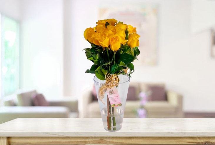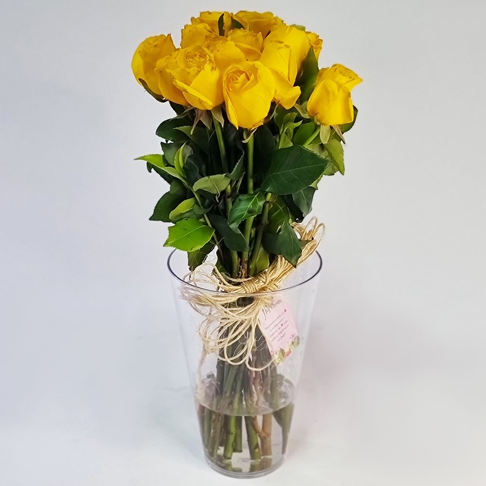Buquê com 12 rosas amarelas e folhas, embalado com laço de ráfia, em um vaso de vidro. Aproximadamente 30 centímetros de altura. Nesta versão, acompanha vaso de vidro ou acrílico transparente.