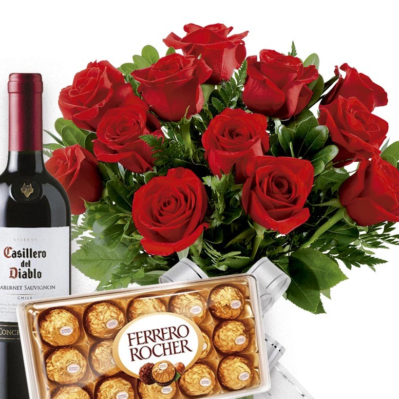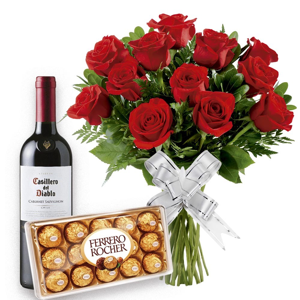 Buquê de Flores Tradition 12 Rosas com Bombons e Vinho