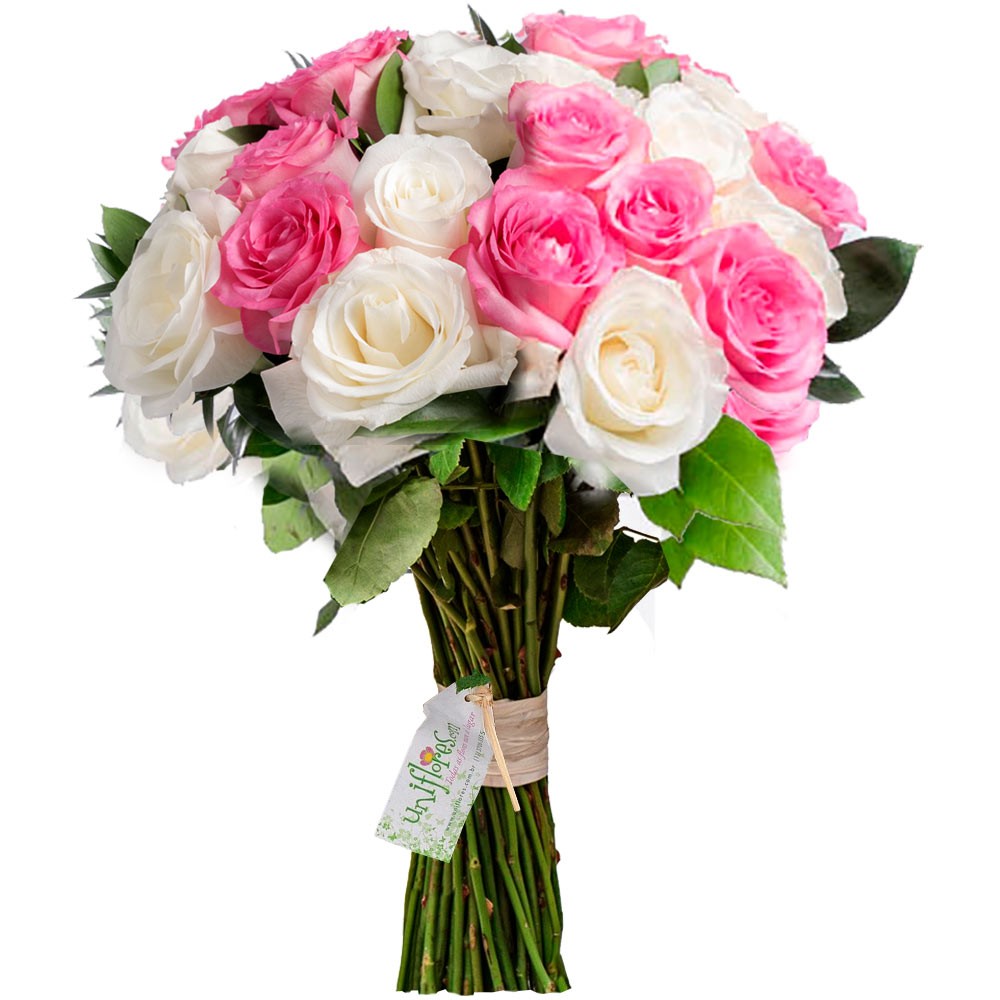 Um lindo buquê com rosas em tons de rosa e brancas/claras, com montagem e folhagens em estilo tradicionais. As rosas são preparadas manualmente para a retirada de espinhos e folhagens excessivas, e o buquê é embalado com laço de ráfia ou fita de cetim. Um presente especial para todos os momentos.