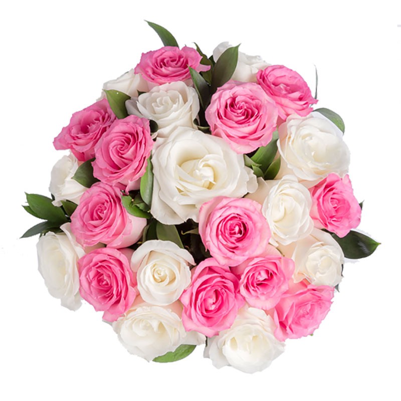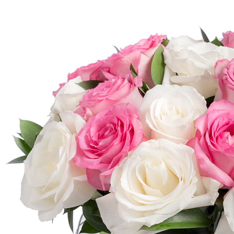Um lindo buquê com rosas em tons de rosa e brancas/claras, com montagem e folhagens em estilo tradicionais em um belo vaso de vidro. As rosas são preparadas manualmente para a retirada de espinhos e folhagens excessivas, e o buquê é embalado com laço de ráfia ou fita de cetim e depois cuidadosamente colocado em um vaso selecionado de vidro que harmonize com o buquê. Um presente especial para todos os momentos.