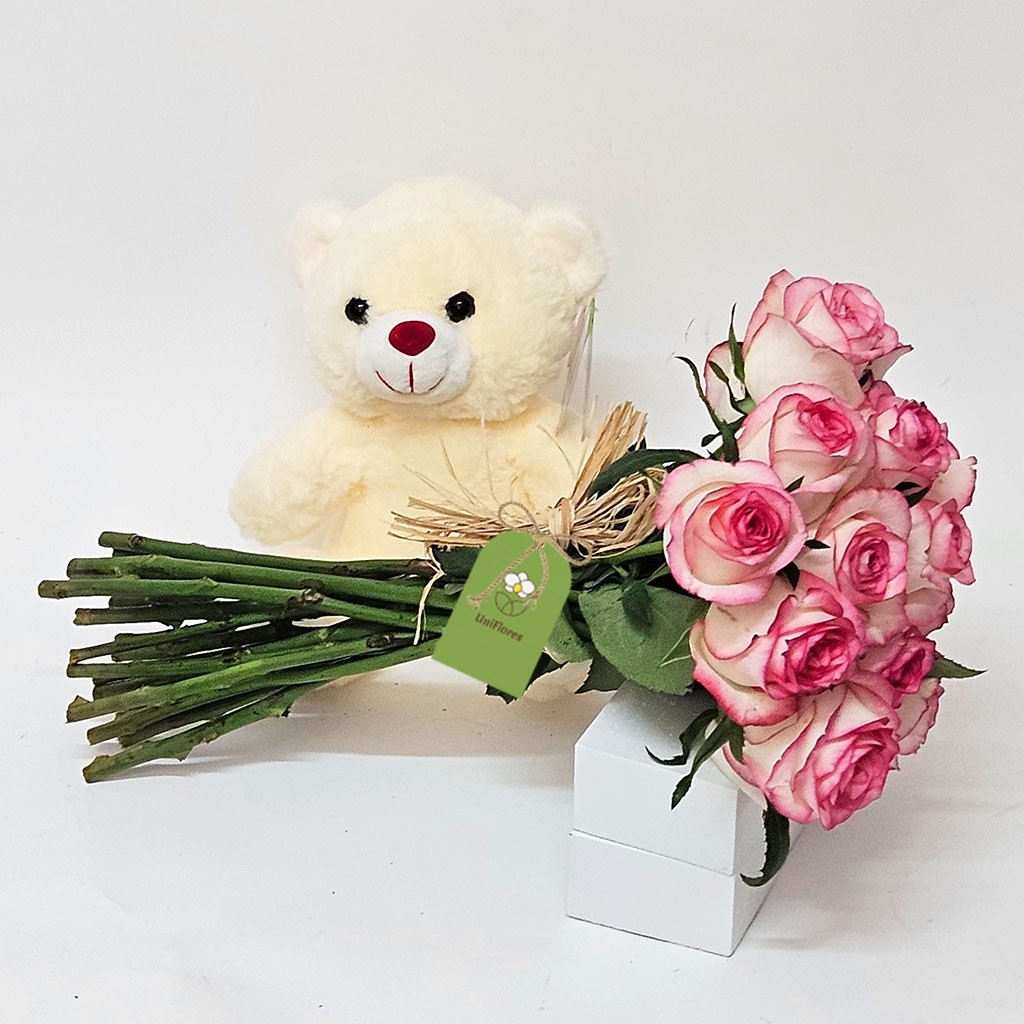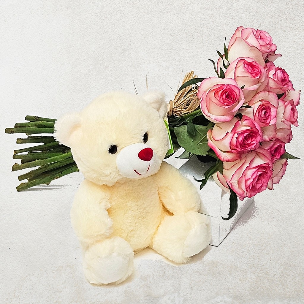 Buquê com rosas em tons de rosa ou mesclado, acompanhado de um ursinho de pelúcia, carinhosamente preparado e embalado para presente. Este buquê de rosas é sempre um presente encantador, romântico e elegante para enviar sua mensagem de carinho em todos momentos especiais. Agende agora sua entrega e diga com flores o que só o coração sabe!