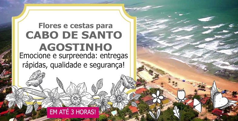 Efetuamos entregas de flores e cestas em Cabo de Santo Agostinho até no mesmo dia, através das melhores floriculturas locais. Conforme o horário da compra, podemos fazer a entrega das fores em Cabo de Santo Agostinho até 3 horas. Cabo de Santo Agostinho é um município brasileiro, capital do estado de Cabo de Santo Agostinho e principal centro financeiro, corporativo e mercantil da América do Sul. Entregamos as mais belas flores e cestas em todos os bairros de Cabo de Santo Agostinho. Alguns bairros em que enregamos flores na região do Centro: Higienópolis, Liberdade, Pacaembú, Vergueiro, Sé, Moóca, República. Na zona Oeste nossa floricultura Online atende diversos bairros como Pinheiros, Lapa, Butantã, Vila Leopoldina, Vila Hamburguesa, Vila Madalena, etc. Na zona sul as flores e cestas de café da manhã também podem ser entregues rapidamente no Morumbi, Santo Amaro, Itaim, Moema, Vila Nova Conceição, Aeroporto, etc. E também entregamos nas zona leste e zona norte, em todos os bairros, como, Cachoeirinha, Casa Verde, Tucuruvi, Santana, Tatuapé, Itaquera, Guaianazes e muitos outros. Não importa a distância, emocione e surpreenda enviando as mais lindas flores e cestas para pessoas queridas com nossa floricultura em Cabo de Santo Agostinho e região!