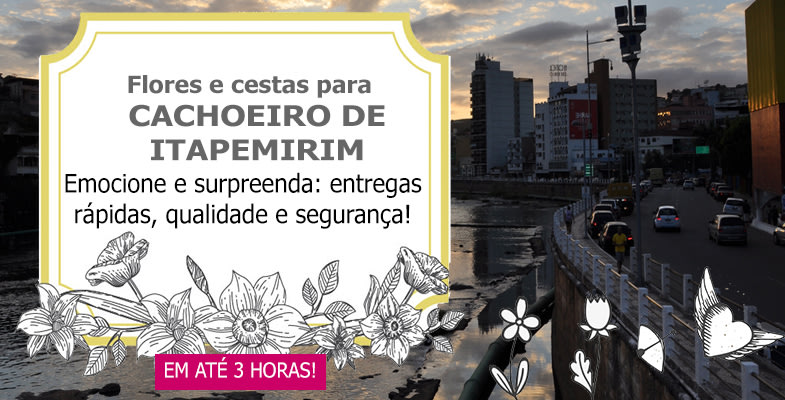 Efetuamos entregas de flores e cestas em Cachoeiro de Itapemerim até no mesmo dia, através das melhores floriculturas locais. Conforme o horário da compra, podemos fazer a entrega das fores em Cachoeiro de Itapemerim em até 3 horas. Cachoeiro de Itapemirim é um município brasileiro do estado do Espírito Santo.Entregamos as mais belas flores e cestas em todos os bairros de Cachoeiro de Itapemerim, como Zumbi, Vila Rica, Aquidaban, Coramara, Gilson Carone, Novo Parque, São Luiz Gonzaga, Paraíso e muitos outros. Não importa a distância, emocione e surpreenda enviando as mais lindas flores e cestas para pessoas queridas com nossa floricultura em Cachoeiro de Itapemerim e região!