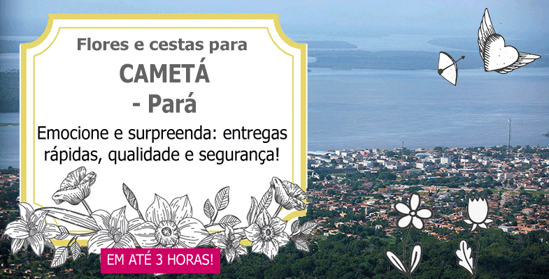 Efetuamos entregas de flores e cestas em Cametáaté no mesmo dia, através das melhores floriculturas locais. Conforme o horário da compra, podemos fazer a entrega das fores em Cametáem até 3 horas. Cametá é um município do estado do Pará, no Brasil. Em 1617, frei Cristóvão de São José, religioso dos Padres Capuchos da Província de Santo Antônio, subiu o Rio Tocantins, desembarcando na margem esquerda. Foi o início da evangelização dos índios camutás. Aos poucos nativos passaram a habitar junto à ermida que havia construído.