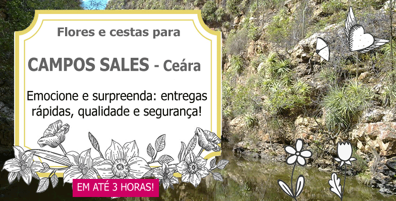 Efetuamos entregas de flores e cestas em Campos Salesaté no mesmo dia, através das melhores floriculturas locais. Conforme o horário da compra, podemos fazer a entrega das fores em Campos Salesem até 3 horas. Campos Sales é um município brasileiro do estado do Ceará. Nas terras localizada ao oeste da Chapada do Araripe, viviam várias etnias tais como os índios Kariri, antes da chegada das entradas no interior brasileiro durante o século XVII.