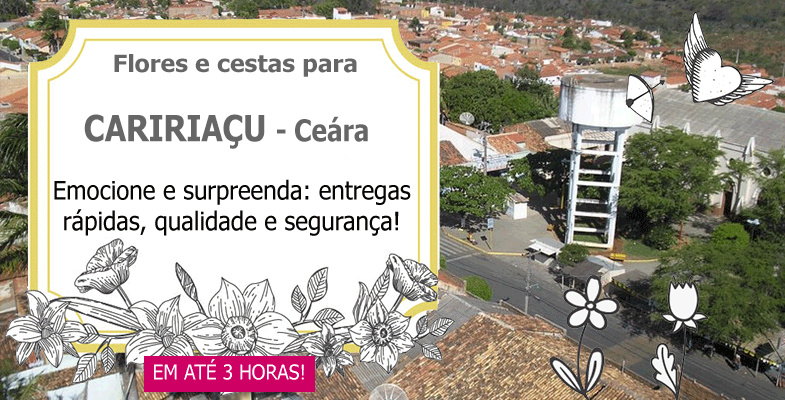Efetuamos entregas de flores e cestas em Caririaçuaté no mesmo dia, através das melhores floriculturas locais. Conforme o horário da compra, podemos fazer a entrega das fores em Caririaçuem até 3 horas. Caririaçu é um município brasileiro do estado do Ceará. As terras da serra de São Pedro eram habitadas pelos índios Kariri, Guari, antes da chegada das entradas no interior brasileiro durante o século XVII. Os integrantes das entradas, militares e religiosos, mantiveram os primeiros contatos com os nativos, estudaram todas a região dos Cariai, catequizaram os indígenas e os agruparam em aldeiamentos ou missões. Os resultados destes contatos e descobrimentos desencadearam notícias que na região tinha ouro em abundância e em seguida desencadeou-se uma verdadeira corrida para os sertões brasileiros, onde famílias oriundas de Portugal, sonhando com as riquezas de terras inexploradas e com a esperança de encontrar o minério, que as levariam a aumentar o seu patrimônio material, além de aumentar o seu prestigio pessoal com a corte portuguesa.