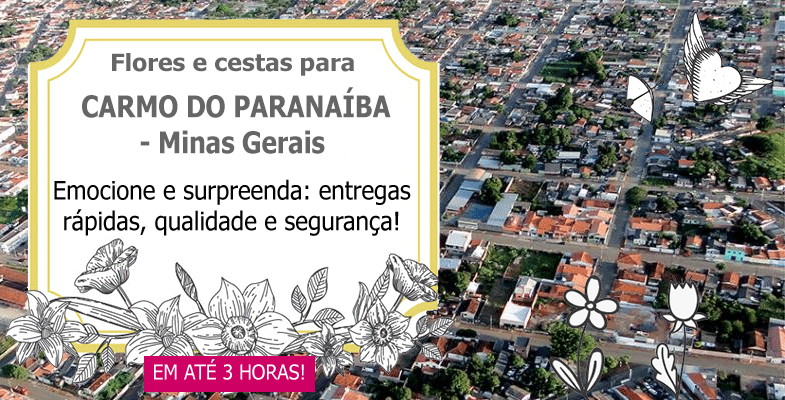 Efetuamos entregas de flores e cestas em Carmo do Paranaíbaaté no mesmo dia, através das melhores floriculturas locais. Conforme o horário da compra, podemos fazer a entrega das fores em Carmo do Paranaíbaem até 3 horas. Carmo do Paranaíba é um município brasileiro do estado de Minas Gerais. Carmo do Paranaíba, antigo distrito criado em 1846 (denominação: Nossa Senhora do Carmo), recebeu status em 1876 de vilae em 4 de outubro de 1887 de cidade.