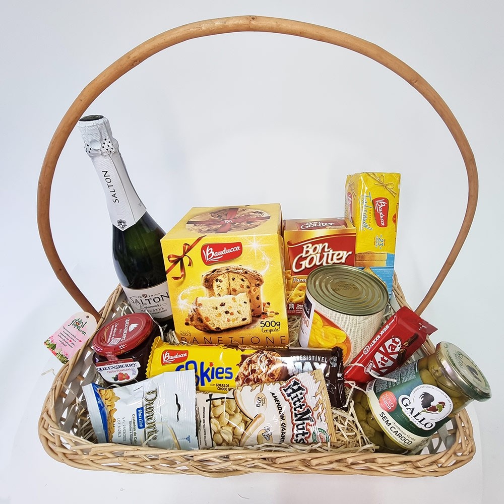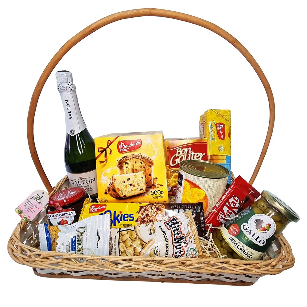 Esta bela cesta para presente é composta por ítens como: Panettone Bauducco 500g, Vinho espumante Salton Moscatel ou similar, Biscoitos Bon Gouter 100g, biscoitos Cookies, Chocolates Kit Kat, Torradas Bauducco, Geléia Queensberry Frutas Vermelhas 280g, Lata de Pêssegos em conserva, Azeitonas em conserva e dois tipos de castanhas e amendoins para petisco. Itens sujeitos a substituição por produto equivalente conforme a cidade da entrega, sempre preservando o bom gosto e qualidade para que seu presente seja entregue em um momento muito especial!