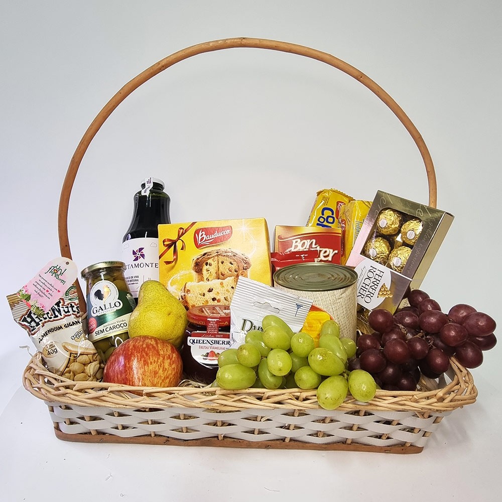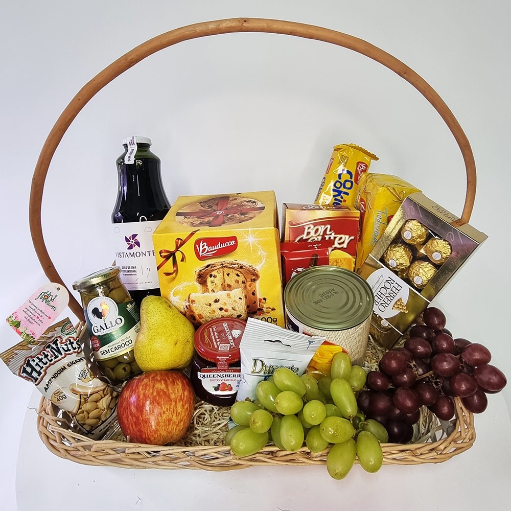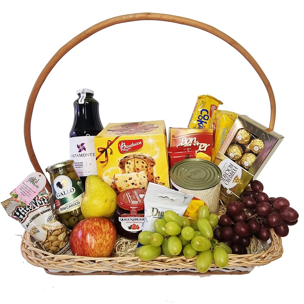 Esta bela cesta para presente é composta por ítens como: Panettone Bauducco 500g, Suco de Uva tinto integral 1 litro, Biscoitos Bon Gouter 100g, Chocolates Kit Kat, Biscoitos Cookies, Geléia Queensberry Frutas Vermelhas 280g, Lata de Pêssegos em conserva, Azeitonas em conserva e dois tipos de castanhas e amendoins para petisco, 4 tipos de frutas selecionadas, como cachos de Uvas, pêras e maçãs e uma caixa com 8 bombons Ferrero Rocher. Itens sujeitos a substituição por produto equivalente conforme a cidade da entrega, sempre preservando o bom gosto e qualidade para que seu presente seja entregue em um momento muito especial!
