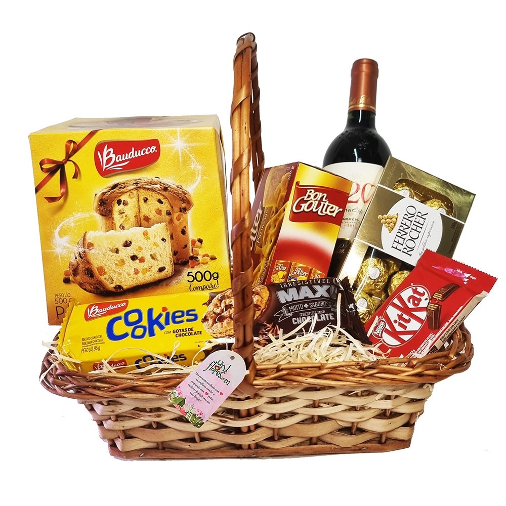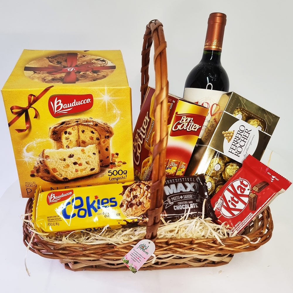 Esta bela cesta para presente é composta por ítens como: Panettone Bauducco 500g, Vinho tinto importado 750 ml, como Casileiro del Diablo Concha e Toro, Santa Rita 120 ou similar, Biscoitos Bon Gouter 100g, biscoitos Cookies, Chocolates Kit Kat e Bombons Ferrero Rocher 199g com 8 bombons. Itens sujeitos a substituição por produto equivalente conforme a cidade da entrega, sempre preservando o bom gosto e qualidade para que seu presente seja entregue em um momento muito especial!