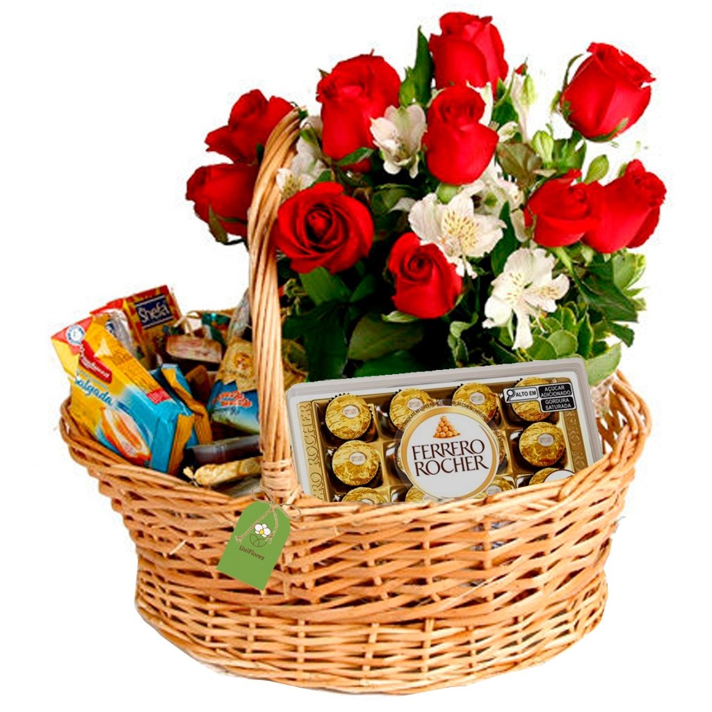 Uma bela cesta de vime com um arranjo de rosas vermelhas e alstroemérias, com uma caixa de bombons Ferrero Rocher (12 bombons) e com produtos para um delicioso café da manhã: 1 Caixa pequena de Suco de frutas 200 ml, 1 Caixa de Achocolatado 'Toddynho' 200 ml, 2 Sachês de Cereal Matinal Sucrilhos Kellog´s 25g, 2 Bolinhos pequenos Bauducco 40g, 2 Torradas pequenas Bauducco 40g, 2 Biscoitos pequenos Maizena Bauducco 40g, 2 Biscoitos pequenos banana e canela Bauducco 40g, 2 Biscoitos pequenos leite Bauducco 40g, 1 Cookie Bauducco pequeno 40g, 2 Pacotinhos de Biscoito ClubSocial 25g, 1 Pacotinho maxi Goiabinha Bauducco 25g, 1 Pacotinho de pão de mel 25g, 1 Geléia de frutas, 1 Saquinho Sachê de Cappucino 3 Corações, 1 Saquinho de Café Solúvel Melita, 1 Saquinho Sachê de Açúcar e 2 Bombons Sonho de Valsa.