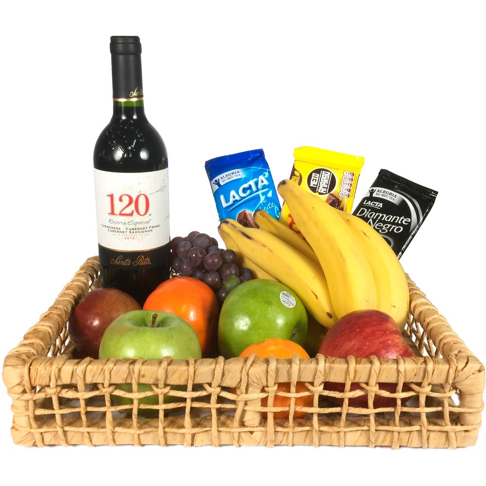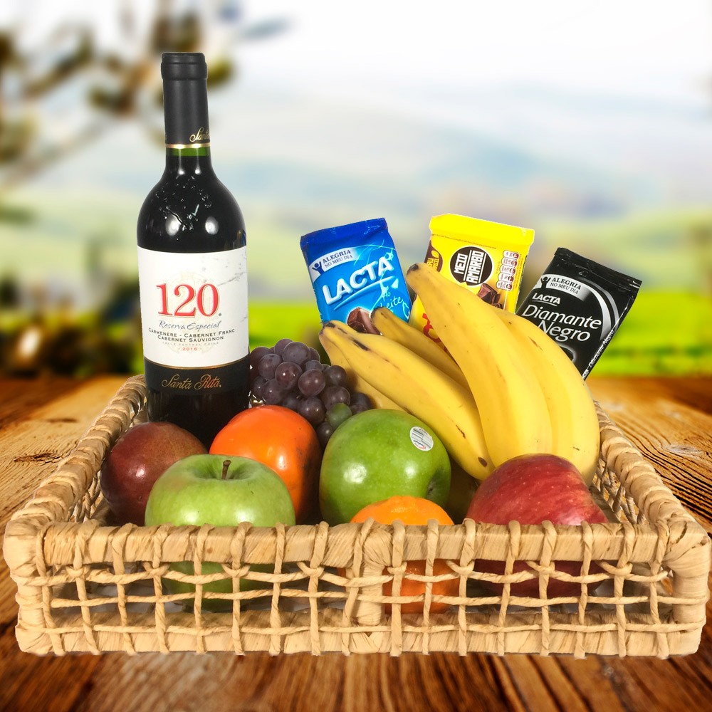 Que tal tornar ainda mais especial o dia de quem você tanto gosta? Surpreenda com uma bela cesta ou bandeija de vime e com deliciosas frutas e chocolates com um vinho tinto sul americano 750 ml. Esta cesta contém itens como: