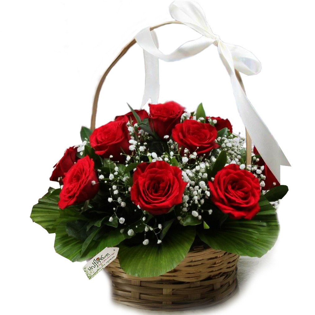 Uma cesta de vime com 10 lindas rosas vermelhas!