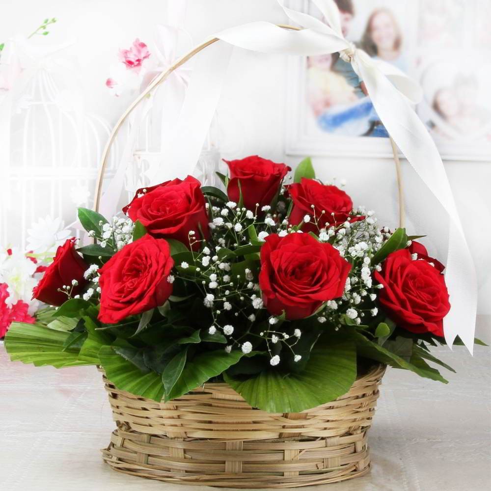 Uma bela cesta de vime com rosas vermelhas, gypsophilas e folhagens, formando uma combinação perfumada, elegante e clássica para presentear. Produzido com rosas frescas e selecionadas, este produto é confeccionado localmente na data da entrega com todo carinho por nossos floristas locais. Assim as flores não sofrem com viagens em longas distâncias, preservando sua qualidade, frescor e perfume.