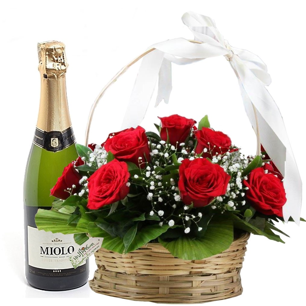 Uma bela cesta de vime com rosas vermelhas, gypsophilas e folhagens, acompanhada de um vinho espumante, em uma garrafa de 750 ml, podendo variar entre opções de espumantes Brasileiros ou Sul Americanos, conforme disponibilidade na cidade de entrega. Este presente forma uma combinação encantadora, perfumada, elegante e clássica para presentear. Produzido com rosas frescas e selecionadas, este produto é confeccionado localmente na data da entrega com todo carinho por nossos floristas locais. Assim as flores não sofrem com viagens em longas distâncias, preservando sua qualidade, frescor e perfume.