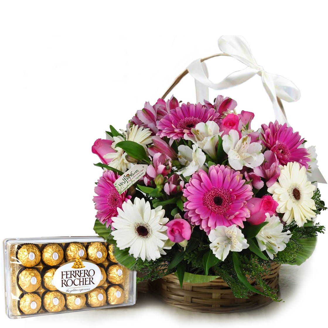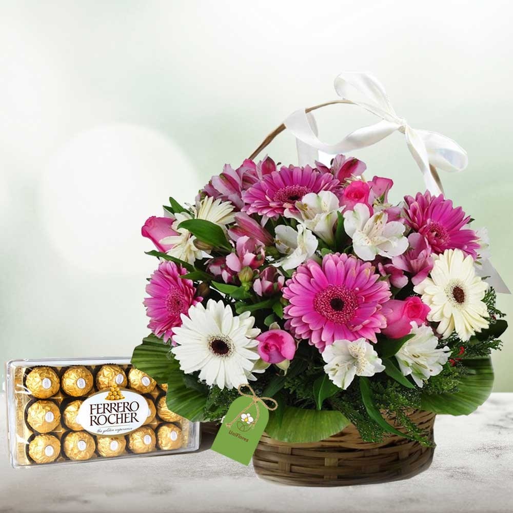 Uma linda cesta de vime bem trabalhada, cesta com Gerberas, Alstroemélias e Rosas em cores brancas e rosa ou roxo, além de uma folhagem em verde acompanhada também de uma caixa de Ferrero Rocher (150g), formando uma combinação perfeita, elegante e leve o que torna essa cesta mais linda e inesquecivel para quem recebe-la. Produzida com lírios e alstroemélias frescas e selecionados, sujeitas por isso à substituição por flores equivalentes conforme a localidade. Esse produto é confeccionado localmente na data da entrega com todo carinho por nossos floristas locais. Assim as flores não sofrem com viagens em longas distâncias, preservando sua qualidade, frescor e perfume.