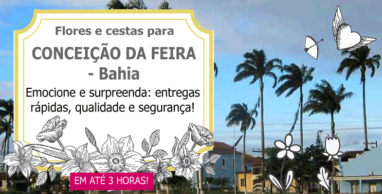 Efetuamos entregas de flores e cestas em Conceição da Feira até no mesmo dia, através das melhores floriculturas locais. Conforme o horário da compra, podemos fazer a entrega das fores em Conceição da Feira em até 3 horas. Conceição da Feira é um município brasileiro do estado da Bahia.