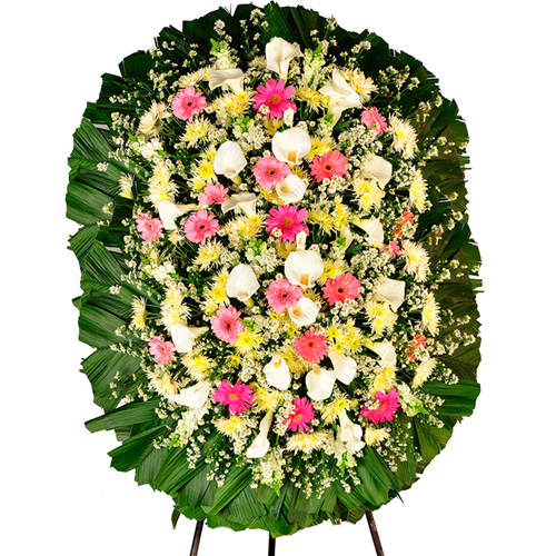 Coroa de flores da linha Luxo, com flores selecionadas e de excelente qualidade. Composição harmônica com flores do campo brancas e gerberas cor de rosa. Envie sua mais bela homenagem póstuma e votos de conforto e condolências. Medidas aproximadas de 1,60m por 1,20m.