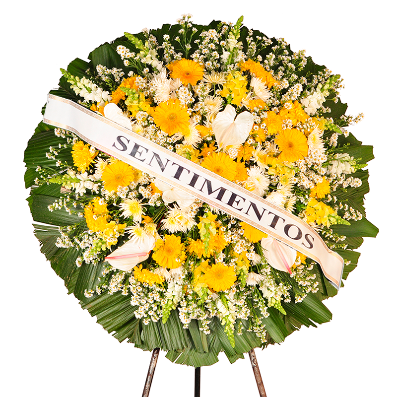Coroa de flores da linha Premium, com flores selecionadas e de excelente qualidade. Composição harmônica com flores do campo brancas, gérberas amarelas e folhagens. Envie sua mais bela homenagem póstuma e votos de conforto e condolências. Medidas aproximadas de 1,00m por 1,00m.