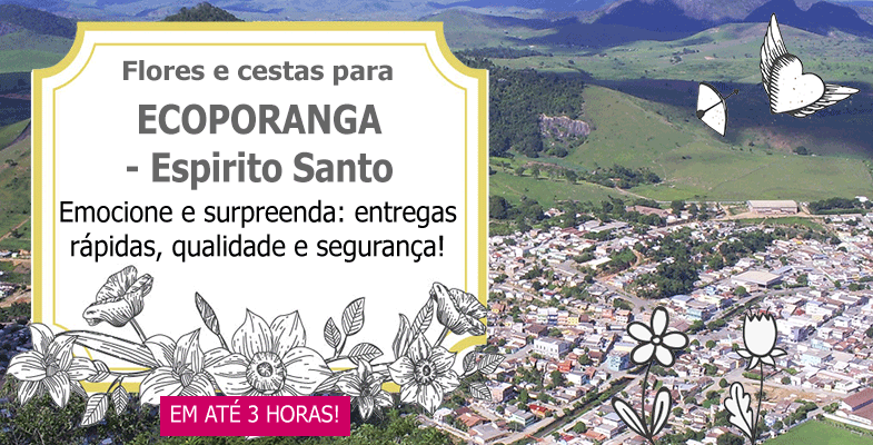 Efetuamos entregas de flores e cestas em Ecoporangaaté no mesmo dia, através das melhores floriculturas locais. Conforme o horário da compra, podemos fazer a entrega das fores em Ecoporangaem até 3 horas. Ecoporanga é um município brasileiro do estado do Espírito Santo. A história de Ecoporanga começa em 1934, quando Jacinto Antônio Dias, um pioneiro, vem das terras de Minas Gerais, saindo de Conselheiro Pena, trazendo junto nesta caminhada de migrante a mulher Guilhermina Joana de Jesus e seus doze filhos. A região era coberta de matas, não havia estradas, meios de transporte e nem energia elétrica. Neste tempo as pessoas andavam a pé ou a cavalo para percorrer as terras do município.