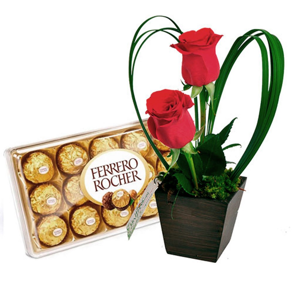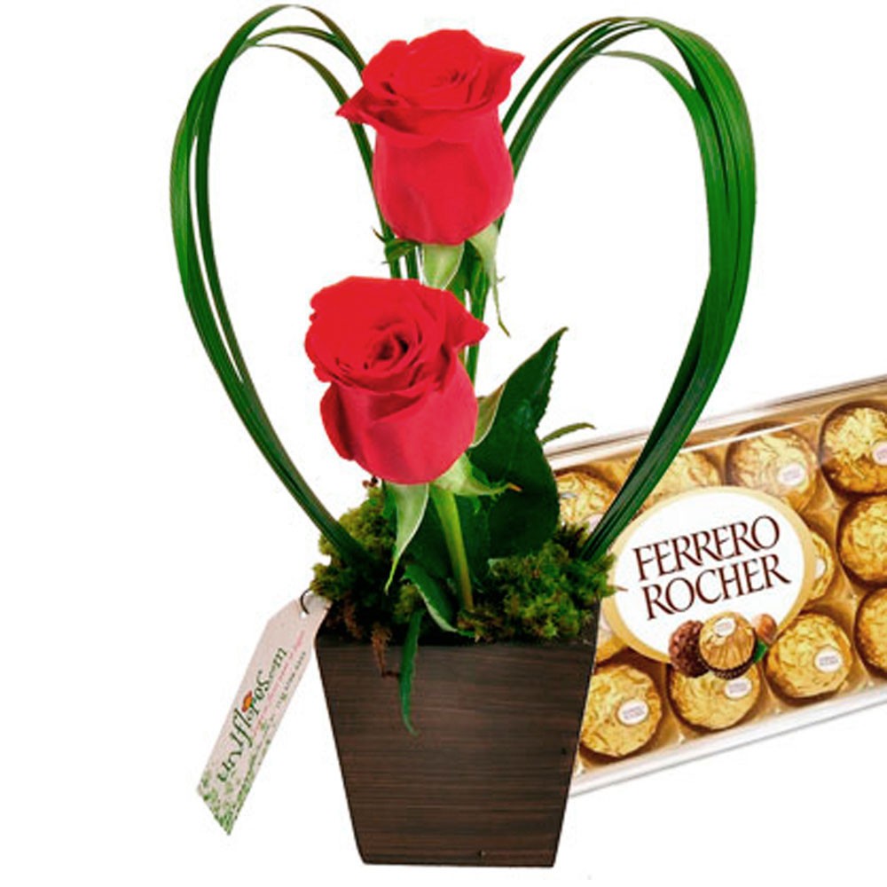 Arranjo em base de madeira com 2 graciosas rosas vermelhas e folhagens trabalhadas em formato de coração. Envie sua mensagem de carinho e surpreenda alguém especial! Produzido com flores frescas e selecionadas, sujeitas por isso à substituição por flores equivalentes conforme a localidade, esse produto é confeccionado localmente na data da entrega com todo carinho por nossos floristas locais. Assim as flores não sofrem com viagens em longas distâncias, preservando sua qualidade, frescor e perfume.