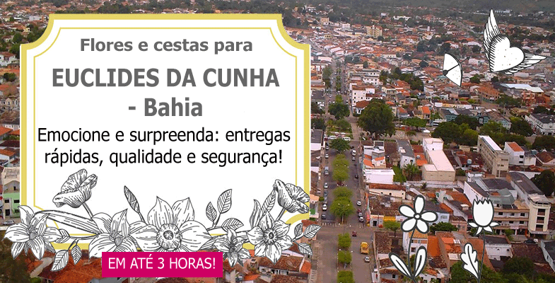 Efetuamos entregas de flores e cestas em Euclides da Cunhaaté no mesmo dia, através das melhores floriculturas locais. Conforme o horário da compra, podemos fazer a entrega das fores em Euclides da Cunhaem até 3 horas. Euclides da Cunha é um município brasileiro do estado da Bahia. Os primeiros habitantes da região foram os índios caimbés, da tribo dos Tupiniquins. Foi desbravado por colonos vindos de regiões circunvizinhas, sobretudo de Monte Santo e Tucano, que se fixaram com suas famílias e dedicaram-se à lavoura e à criação de gado; até hoje bases da economia municipal.