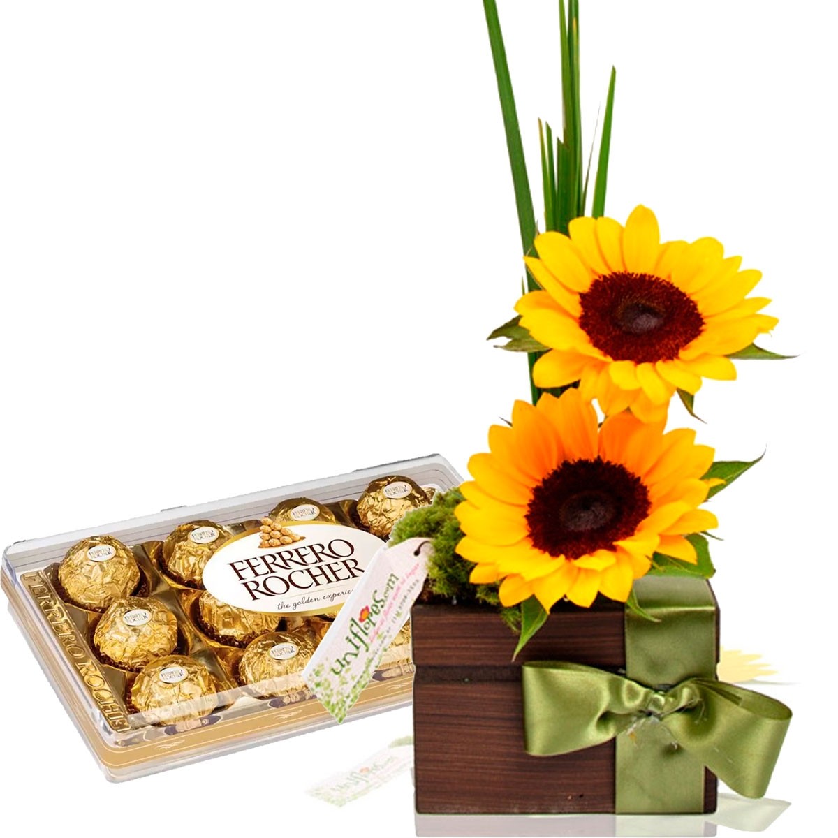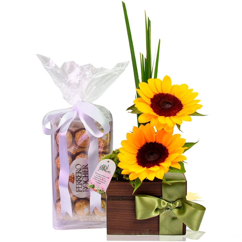 Uma linda opção para você presentear e emocionar, não importa a distância: um delicado, elegante e radiante arranjo com dois belos girassóis e folhagens em uma base de madeira decorada. Aproximadamente 30 cm de altura. Envie sua mensagem de carinho através das flores! Em algumas cidades, principalmente nas regiões mais quentes do país, o girassol deste arranjo pode ser substituído por gérberas amarelas ou alaranjadas.