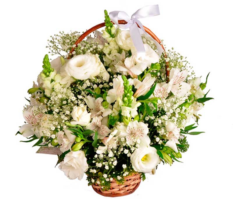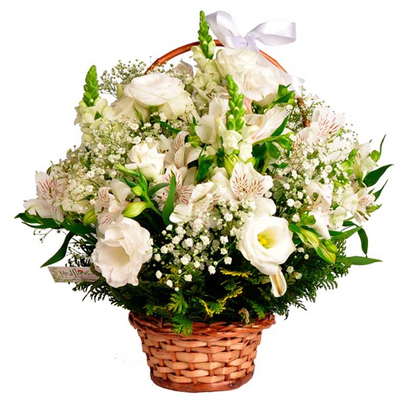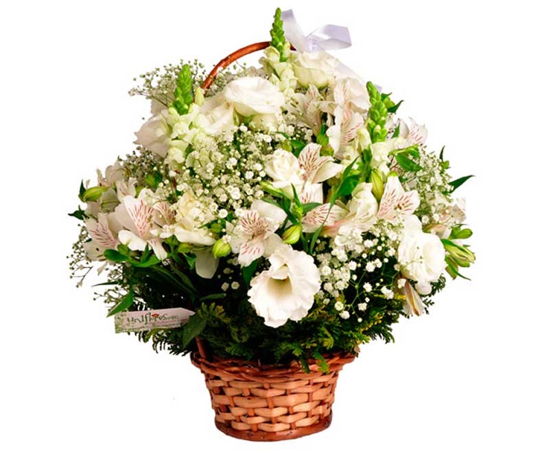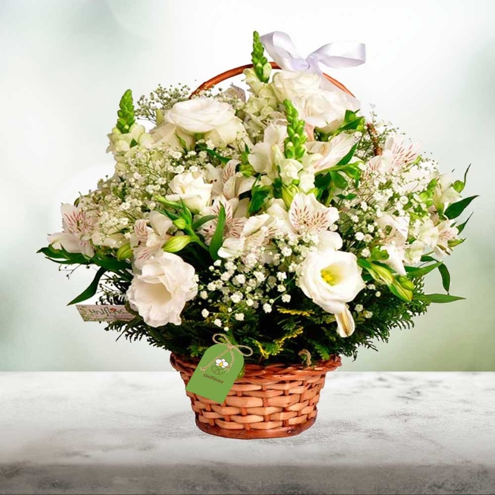 Esta charmosa cesta combina a beleza e perfume de diversas flores nobres de época, como alstroemérias, lisianthus, rosas, etc, formando uma combinação harmônica e elegante em tons de branco e com folhagens. Produzido com flores frescas e selecionadas, sujeitas por isso à substituição por flores equivalentes conforme a localidade, esse produto é confeccionado localmente na data da entrega com todo carinho por nossos floristas locais. Assim as flores não sofrem com viagens em longas distâncias, preservando sua qualidade, frescor e perfume.
