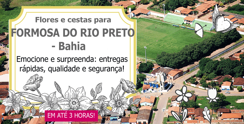 Efetuamos entregas de flores e cestas em Formosa do Rio Preto até no mesmo dia, através das melhores floriculturas locais. Conforme o horário da compra, podemos fazer a entrega das fores em Formosa do Rio Preto em até 3 horas. Formosa do Rio Preto é um município brasileiro do estado da Bahia. O território integrava o sertão de Pernambuco. Seu povoamento iniciou-se na primeira metade do século XIX por aventureiros procedentes do Piauí, à procura de ouro e pedras preciosas numa região habitada pelos índios aimorés. Estabelecendo-se à margem esquerda do rio Preto, dedicaram-se à criação de gado e à agricultura de subsistência, formando um povoado, que se tornou ponto de pouso para tropeiros e viajantes em trânsito para o Piauí, norte de Goiás (atual Tocantins), além do sul do Maranhão.