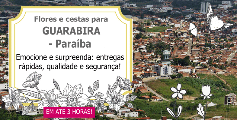 Efetuamos entregas de flores e cestas em Guarabiraaté no mesmo dia, através das melhores floriculturas locais. Conforme o horário da compra, podemos fazer a entrega das fores em Guarabiraem até 3 horas. Guarabira é um município do estado da Paraíba, no Brasil. É nona cidade mais populosa do estado, com 58 mil habitantes. Situa-se a 98 quilômetros da capital estadual João Pessoa; a 100 quilômetros de Campina Grande, mais populosa cidade do interior paraibano; a 198 quilômetros de Natal, a capital do Rio Grande do Norte; e a menos de 250 quilômetros do Recife, a capital de Pernambuco.