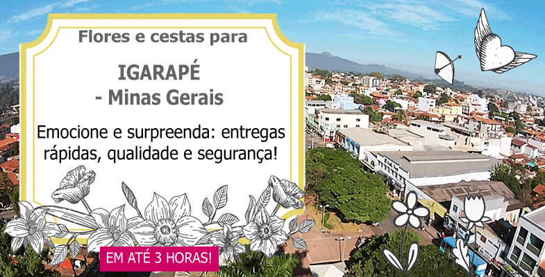 Efetuamos entregas de flores e cestas em Igarapéaté no mesmo dia, através das melhores floriculturas locais. Conforme o horário da compra, podemos fazer a entrega das fores em Igarapéem até 3 horas. Igarapé é um município da Região Metropolitana de Belo Horizonte, no estado de Minas Gerais, no Brasil. Até o século XVII, o atual estado de Minas Gerais era habitada por índios do tronco linguístico macro-jê. A partir desse século, essas tribos foram quase exterminadas pela ação dos bandeirantes procedentes de São Paulo, que chegaram à região em busca de escravos e de pedras preciosas.