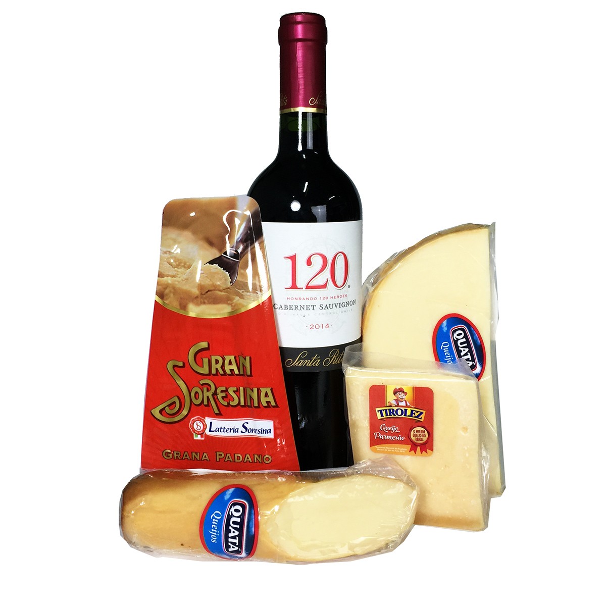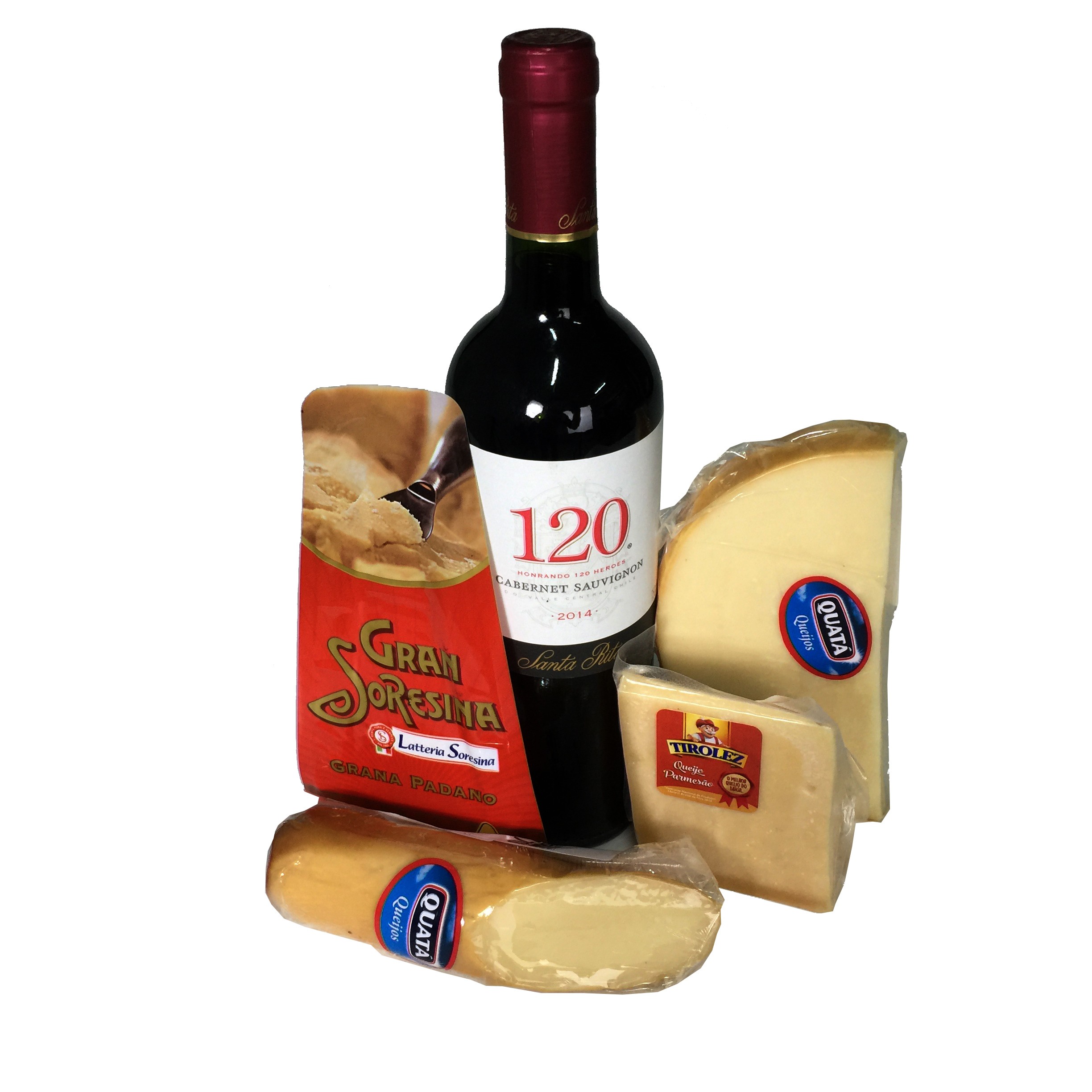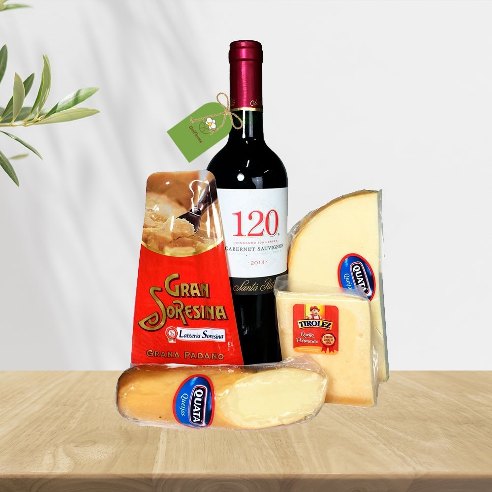 Envie sua mensagem de boas festas, demonstrando carinho, afeto e gratidão! Este kit de natal sofisticado contém um Vinho Tinto Cabernet Sauvignon Santa Rita (750ml), Queijo Parmesão Tirolez (176g), Queijo Provolone Quatá (250g), Queijo Grana Padano Italiano Gran Soresina (125g) e Queijo Provolone Quata (212g).