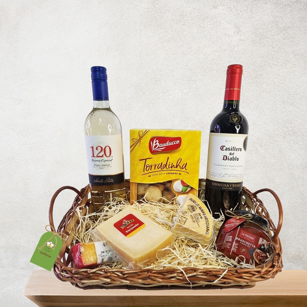 Esta bela cesta para presente é composta por ítens como: Um vinho tinto e um branco 750 ml (Chilenos ou Argentinos), 3 tipos de queijo, uma Bruschetta (ou paté ou geléia) e torradas. Itens sujeitos a substituição por produto equivalente conforme a cidade da entrega, sempre preservando o bom gosto e qualidade para que seu presente seja entregue em um momento muito especial!