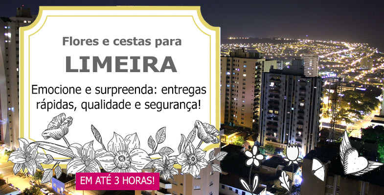 Efetuamos entregas de flores e cestas em Limeira até no mesmo dia, através das melhores floriculturas locais. Conforme o horário da compra, podemos fazer a entrega das fores em Limeira em até 3 horas. Limeira é um município brasileiro situado no Centro-Leste do estado de São Paulo. Entregamos as mais belas flores e cestas em todos os bairros de Limeira, como Jardim Presidente Dutra, Pinhal, Tatu, Vila Cláudia, Piratininga, Vila Queiroz, Ouro Verde e muitos outros. Não importa a distância, emocione e surpreenda enviando as mais lindas flores e cestas para pessoas queridas com nossa floricultura em Limeira e região!